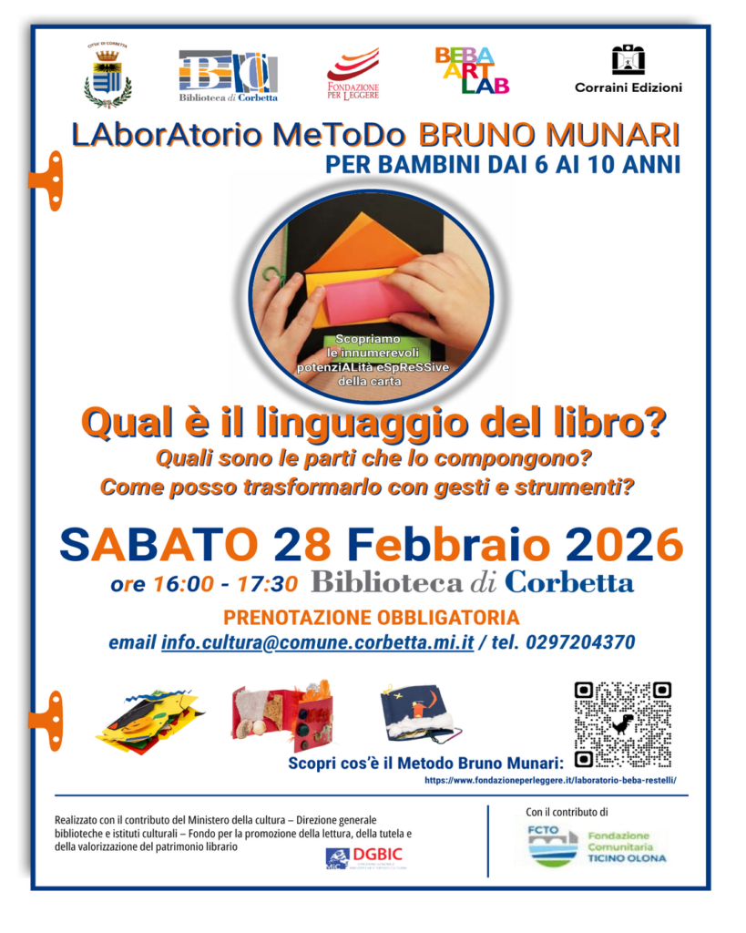 Durante il 2026, Fondazione per Leggere, grazie alla collaborazione di Beba Restelli, di Cristina Bortolozzo (operatrice certificata del Metodo Bruno Munari®) e di Corraini Edizioni, realizza il progetto “Fare libri! Dentro i libri! – Scopriamo Bruno Munari in biblioteca con il laboratorio di Beba Restelli”.